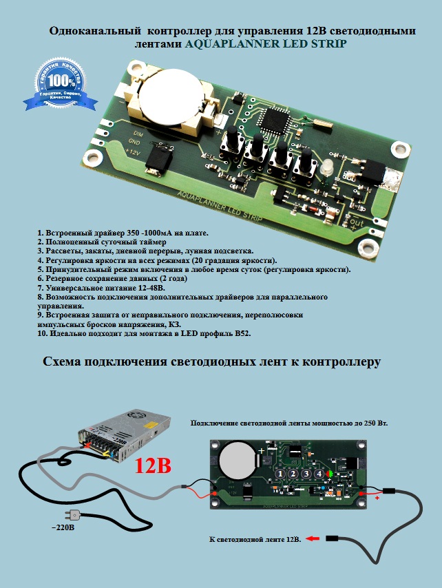 В данный момент на рынке светодиодных контроллеров, большое количество предложений для управления светодиодных smd лент и светильников построенных на таких лентах и полосах. Но, пока ни один контроллер не может предложить простейшие и нужные функции которыми обладает AQUAPLANNER LED STRIP, да к тому же, еще и работать с мощностью до 350Вт.